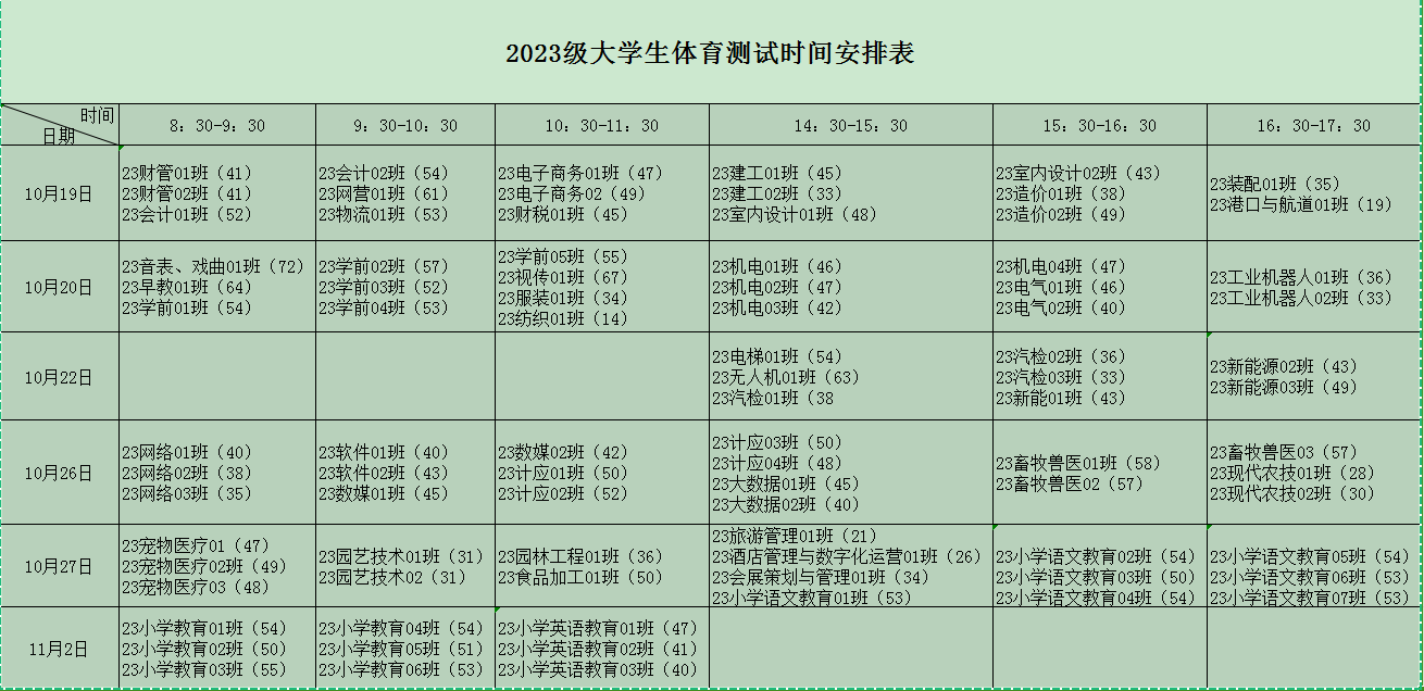 2023级大学生体育测试时间安排表
